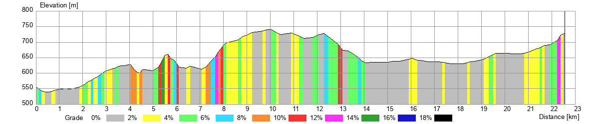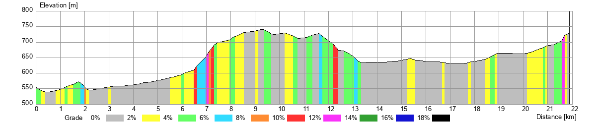 – Alternative route, notice how the beginning is more eventful, with climb gradient sometimes surpassing 10%. That’s the extra elevation you gain on the alternative stretch, walking over small hills rather than following flat terrain. From km 7 both routes are identical.