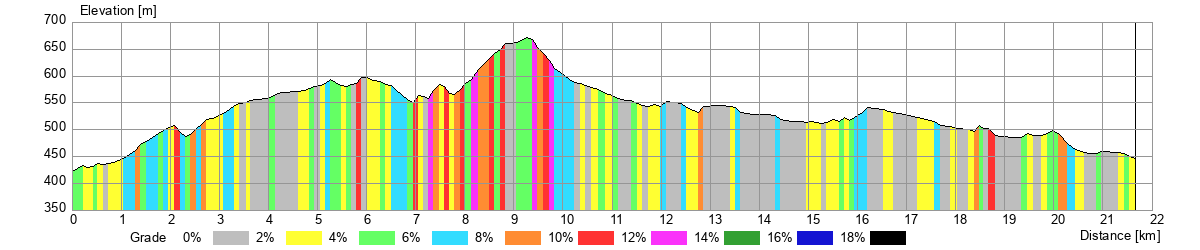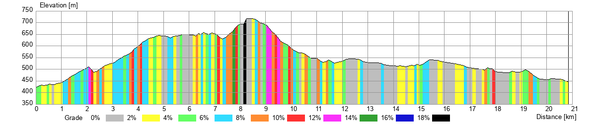 – Alternative route, pretty similar profile to the official camino, just a bit steeper in both climb and descent from the highest point at km 9. You will also climb about 50 meters higher above sea level following this variant.