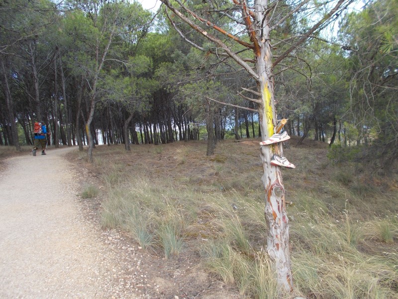 – Things get better later on, with more shade and trails, at least in the middle part of today’s stage. Notice the pair of shoes pilgrims left on the tree. You will see dozens of those, if not hundreds, until you reach Santiago.