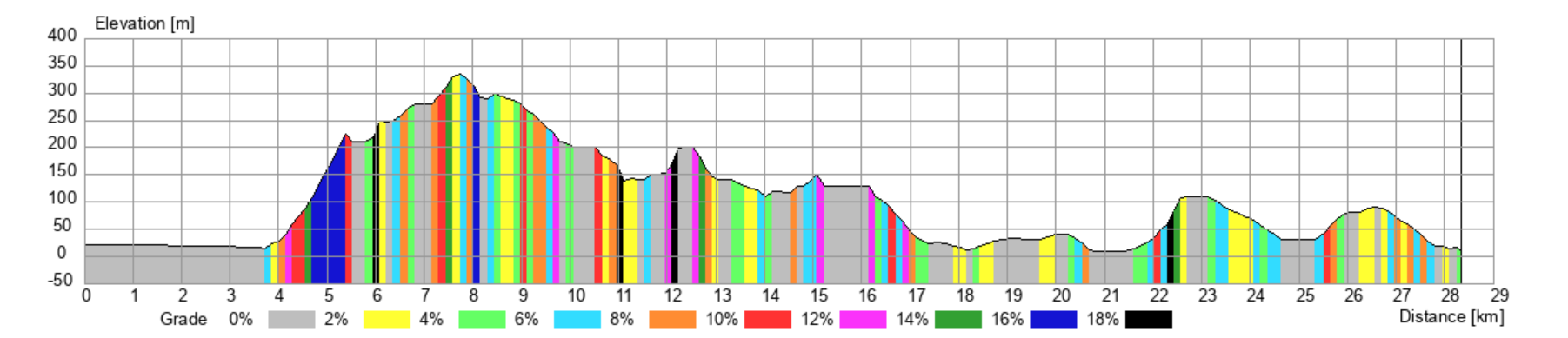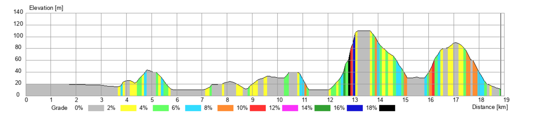 – Official camino, first 12 kilometers are very flat and then things heat up a bit, with the steepest climb between km 12 and 13, with gradient sometimes surpassing 16%. Then one more climb before the end. Still, climbing 220 meters on 19 kilometers cannot be considered a mountainous stage, in any means :).